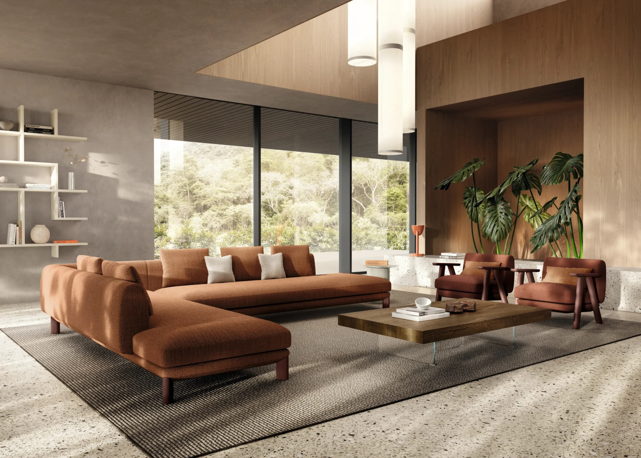 واستمتع بغرفة معيشة تجمع بين الأناقة، الراحة، والتصميم المعماري المبتكر.