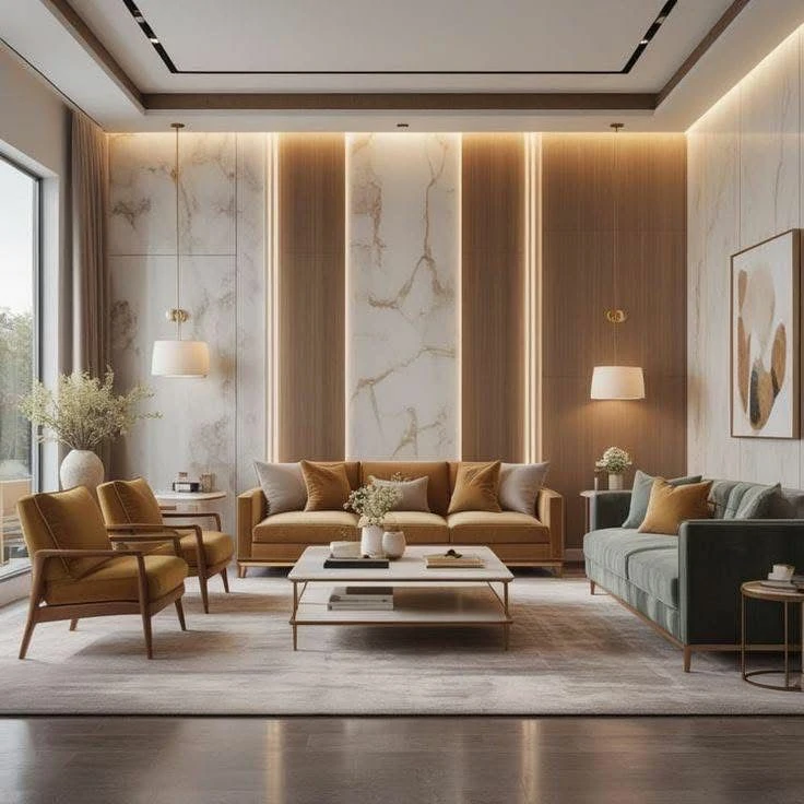 • كنبة ثلاثية مركزية: باللون الخردلي الدافئ، ظهر مستقيم مع وسائد مريحة.