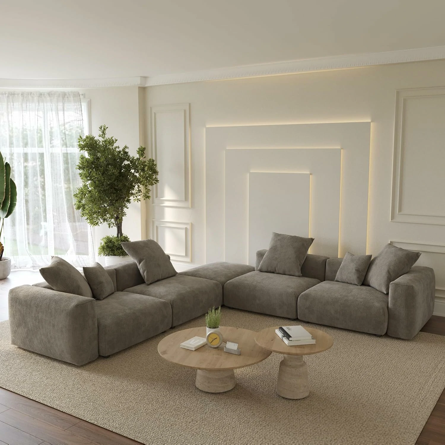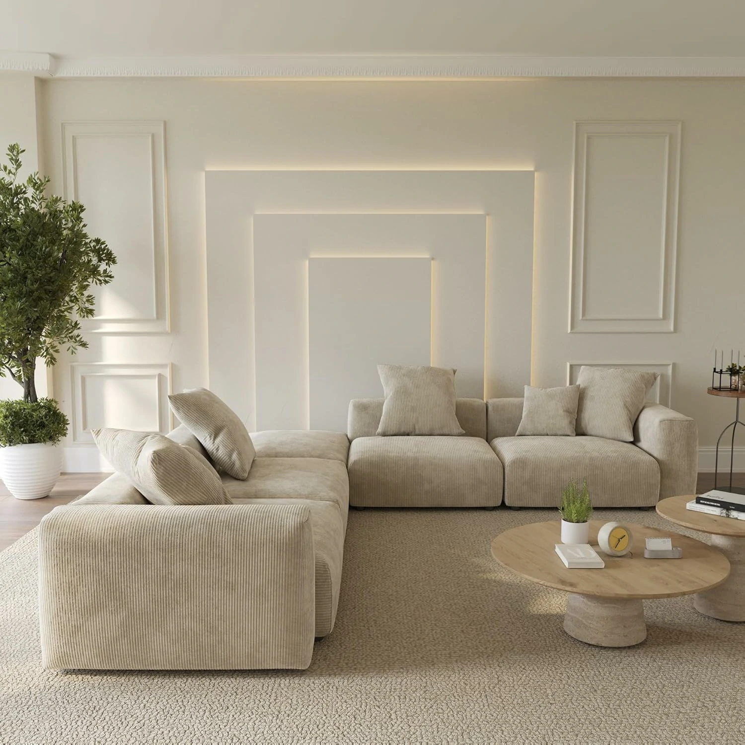 كنبة زاوية فانا المعيارية بتصميم حرف V عصري، تجمع بين الراحة القصوى والمرونة العالية في الترتيب. بفضل نظامها الموديولار القابل للعكس، يمكن إعادة تشكيلها بسهولة لتناسب مختلف المساحات، مما يجعلها خيارًا مثاليًا لغرف المعيشة العائلية الكبيرة ولمحبي الجلسات الواسعة والمريحة.