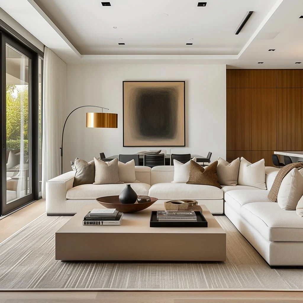 تم كسر حيادية اللون باستخدام وسائد بدرجات البيج الرملي، البني النحاسي، والرمادي الدافئ، لخلق تناغم بصري يربط الركنة مع الطاولة الخشبية واللوحات الجدارية.